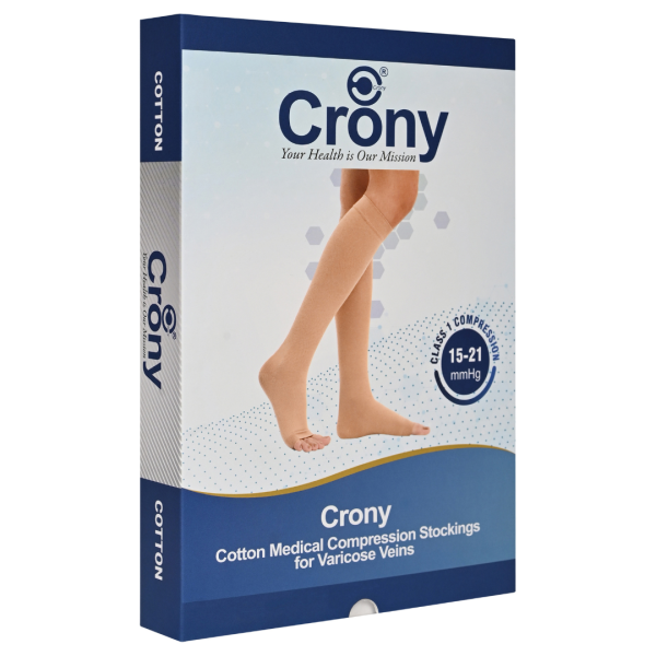• Crony Cotton Varicose Vein Stockings provide Class I (15-21 mmHg) compression level, Color – Beige, Open Toe, Material Composition: 25% Cotton, 45% Nylon, 30% Spandex