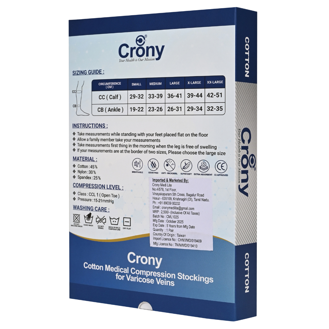 Cotton is naturally Skin FriendlyVery Cool, Breathable and Comfortable. Cotton is one of the coolest fabrics for summer and hot weather. Crony Cotton compression socks are absolutely ODOUR FREE and very much skin friendly. Crony medical Compression stockings for varicose veins which provides No Skin Irritation, No Itching and No Rashes (Material Composition: 45% cotton, 25% nylon, 30% spandex).