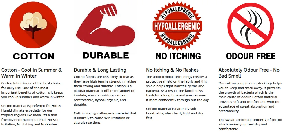 Cotton is naturally Skin Friendly, Very Cool, Breathable and Comfortable. Cotton is one of the coolest fabrics for summer and hot weather. Crony Cotton compression socks are absolutely ODOUR FREE and very much skin friendly. Crony medical Compression stockings for varicose veins which provides No Skin Irritation, No Itching and No Rashes (Material Composition: 45% cotton, 25% nylon, 30% spandex).
