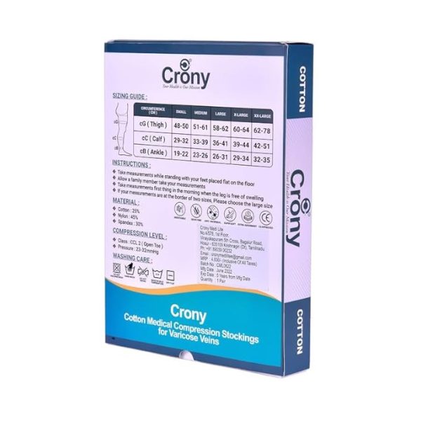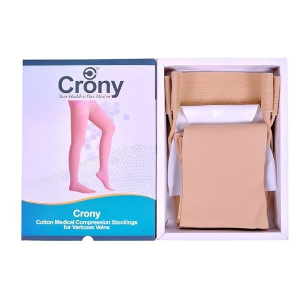 • Crony Cotton Varicose Vein Stockings provide Class II (23-32 mmHg) compression level, Color – Beige, Open Toe, Material Composition: 25% Cotton, 45% Nylon, 30% Spandex